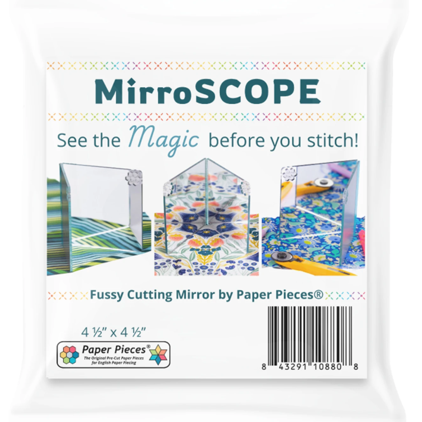 Preview your fussy cuts like never before with the Mirroscope — our 4.5″” square, portable mirror tool designed for quilters who love to play with pattern and symmetry. Made from lightweight mirrored acrylic, it’s shatterproof, impact-resistant, and perfectly sized to tuck in your project bag. Glide it across your fabric to test motifs, explore repeats, and audition dazzling design possibilities.