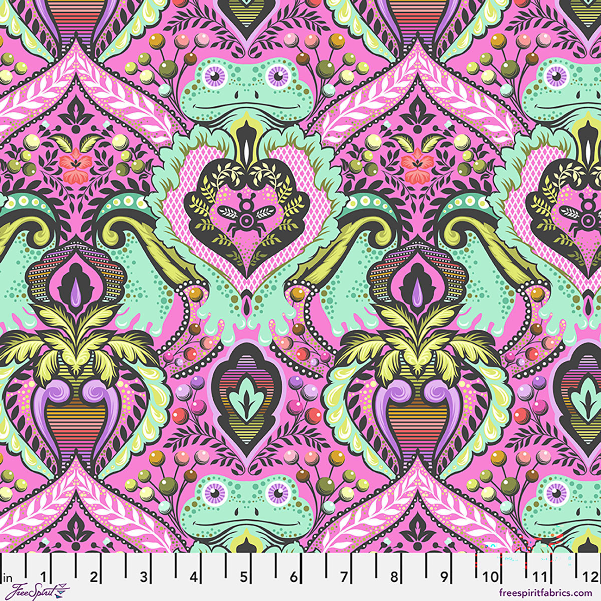 Tula Pink’s statement about the collection: “The Déjà Vu fabric collections are a special, small selection of fabrics that I put together for collectors, both old and new. As my older fabrics become harder to find and increase in value, I wanted to give people who are newer to my world a shot at these older designs without having to spend collector prices on them. At the same time, I don’t want to devalue those fabrics that people have already collected and cherished for so many years. My solution to this problem is “Déjà Vu”—a single new colorway of an old favorite! This time, I have chosen to revisit Prince Charming. Originally released in 2011 in navy, coral, olive, and aqua, this new version has the volume turned way up! Our favorite royal frog is back on a luscious bubblegum pink ground with twice as many print colors as the original. All of the prints have been re-envisioned in a rainbow of colors, adding more depth and complexity. Designed to stand alone, and also to be enhanced with True Colors, this collection really fills out the color palette.”