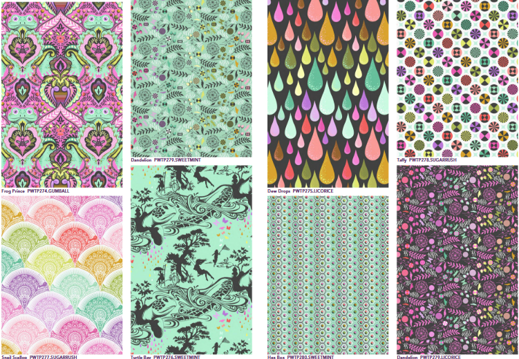 Tula Pink’s newest collection for the Deja Vu fabrics “Prince Charming”  includes 8 newly inspired and recolored designs, featuring the infamous frog prince.