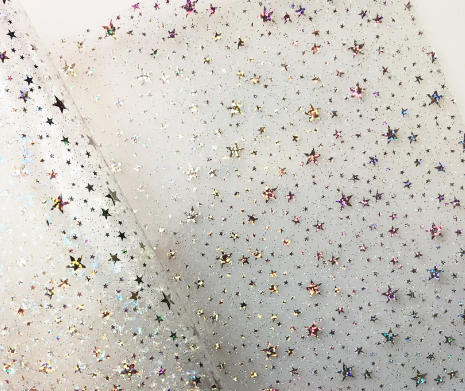 See-through clear vinyl dotted with iridescent glitter stars! This is so beautiful! The stars change colors in the light. This vinyl is 12 gauge, as described below — It sews perfectly with a Teflon foot and chrome microtex needle. Great for crafts, sewing, jewelry making, and more. This is a TPU vinyl like most of my products, and this component makes it pliable and sturdy for bag making.