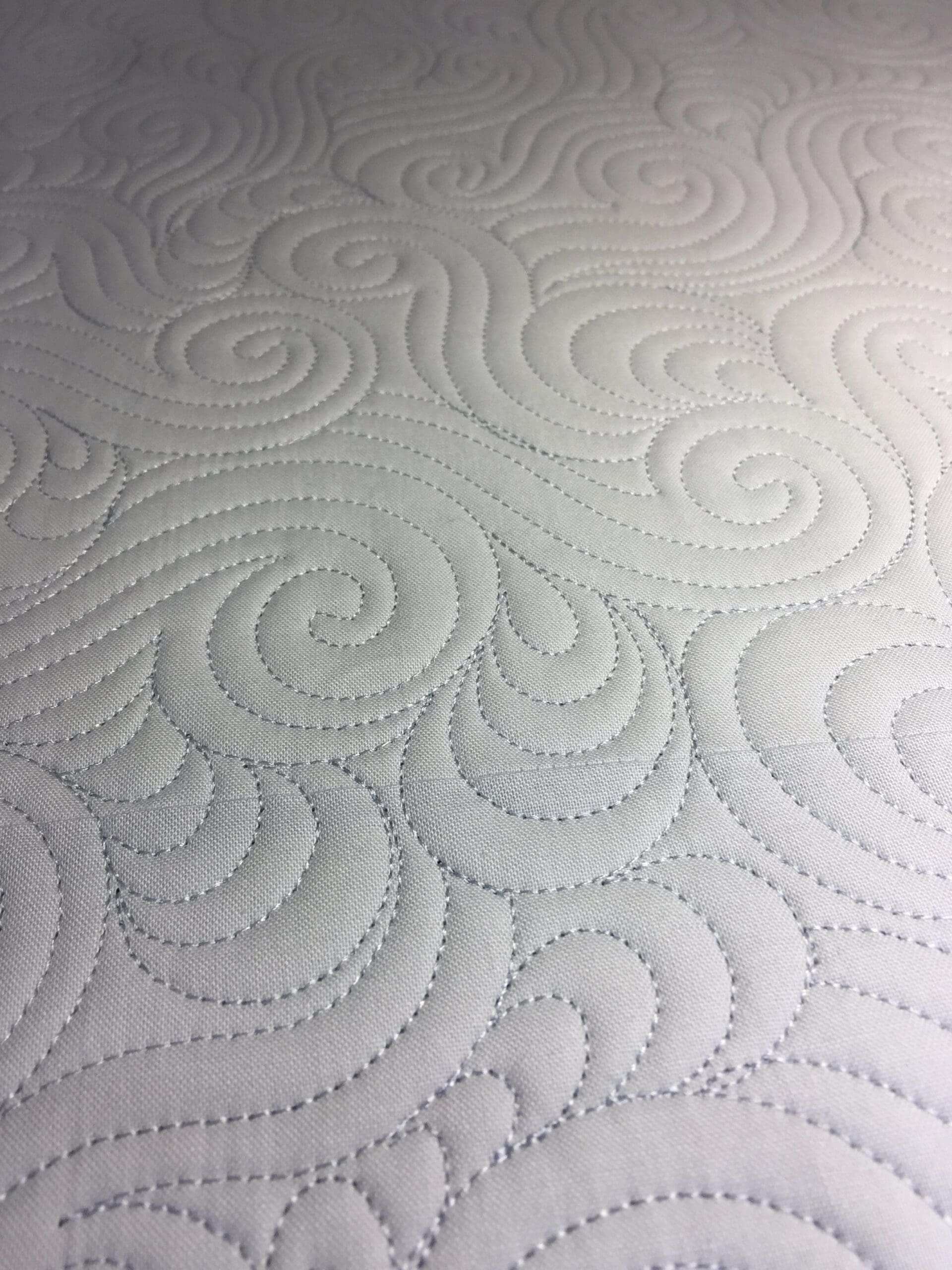 When I met with Katelen for her quilting consultation, we decided on some clean straight line quilting (not too dense), and outline the appliques with some stitch in the ditch and surround them with medium-sized swirls. I used Glide thread in a 50 wt. light teal color that matched the duck (along with a lighter cream color for the swirls), and used a single layer of Quilter’s Dream Wool batting.
